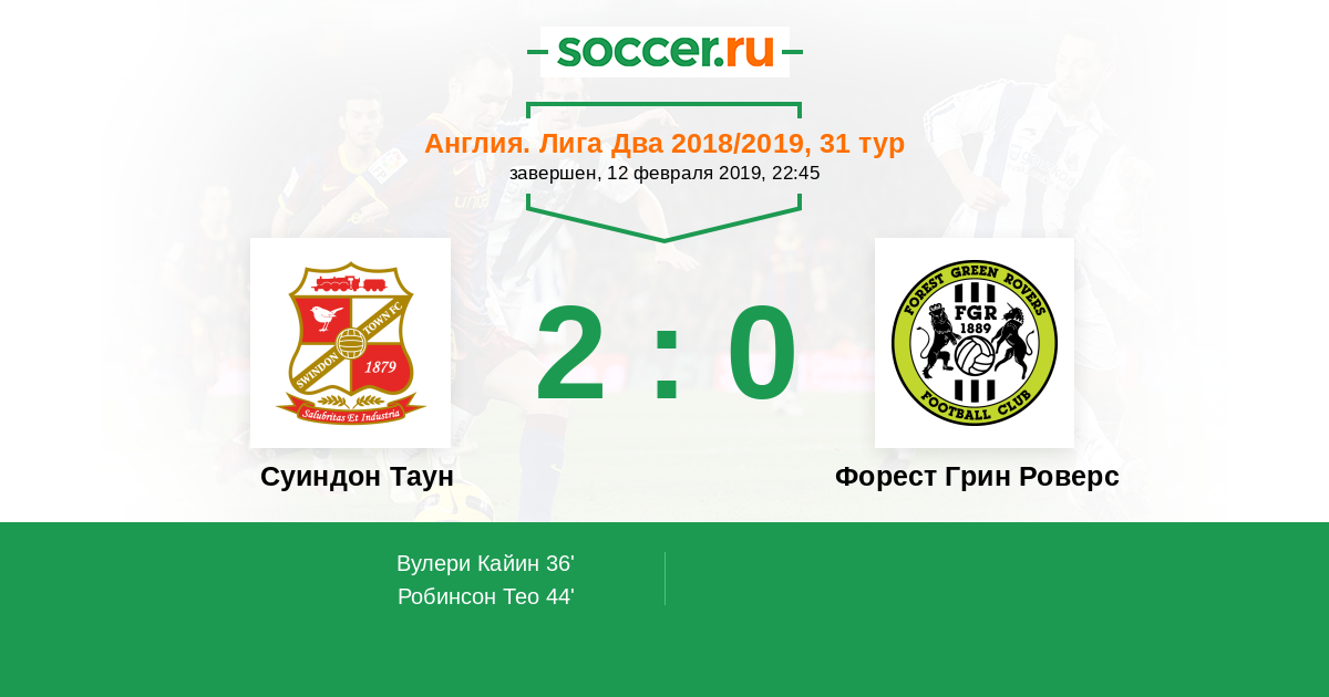 Англия. Вторая Футбольная Лига 13.01.2018 Суиндон Таун Логотип футбольный клуб Суиндон Таун 1:0 Логотип футбольный клуб Форест Грин Роверс (Нейлсворт) Форест Грин Роверс