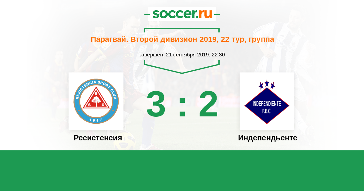Парагвай. Второй дивизион 09.06.2019 Индепендьенте Логотип футбольный клуб Индепендьенте (Луке) 2:3 Логотип футбольный клуб Ресистенсия (Асунсьон) Ресистенсия