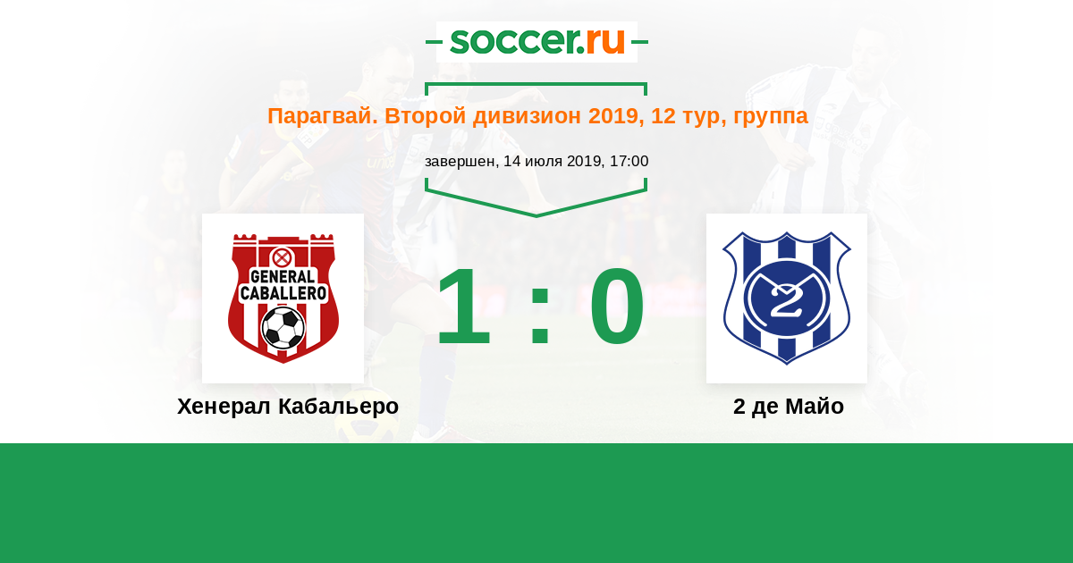 Парагвай. Второй дивизион 27.10.2019 2 де Майо Логотип футбольный клуб 2 де Майо (Педро-Хуан-Кабальеро) 2:0 Логотип футбольный клуб Хенерал Кабальеро (Доктор-Хуан-Леон-Майоркин) Хенерал Кабальеро