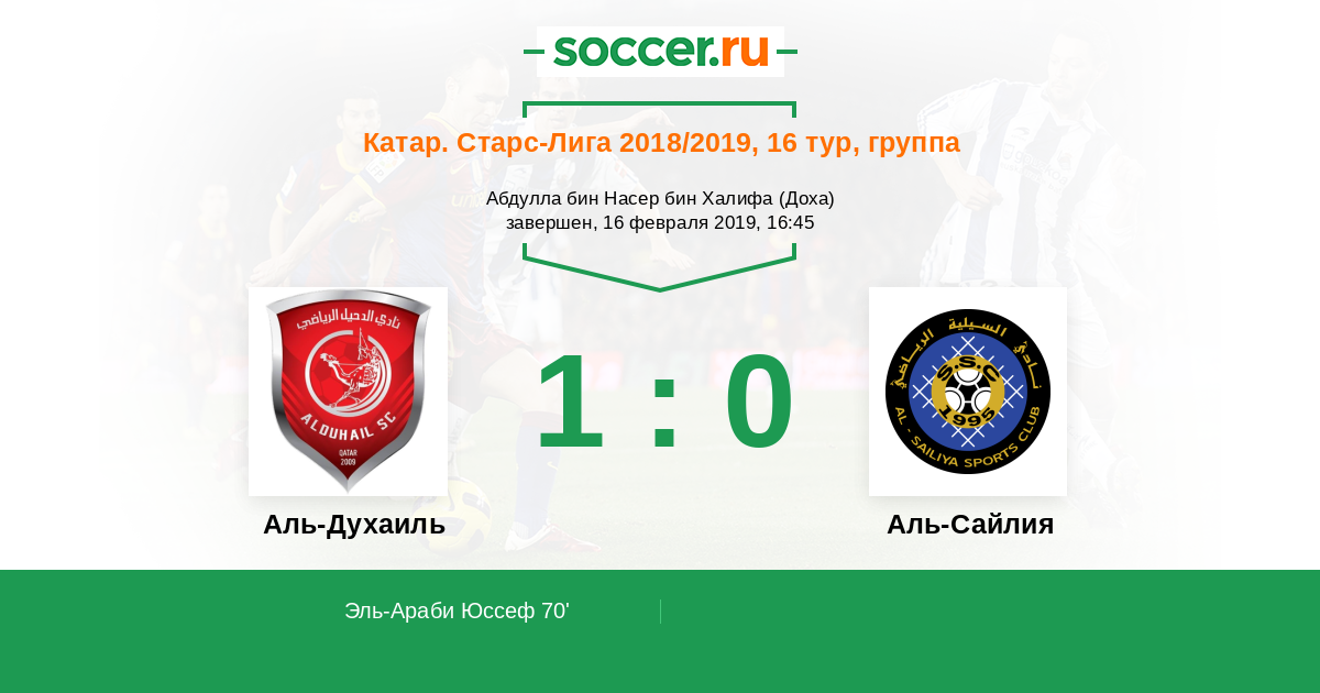 Катар. Старс Лига 30.10.2018 Аль-Сайлия Логотип футбольный клуб Аль-Сайлия (Доха) 0:1 Логотип футбольный клуб Аль-Духаиль (Доха) Аль-Духаиль