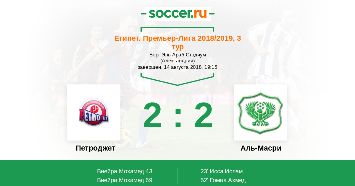 Египет. Премьер-Лига 14.09.2017 Петроджет Логотип футбольный клуб Петроджет (Суэц) 0:1 Логотип футбольный клуб Аль-Масри (Порт-Саид) Аль-Масри