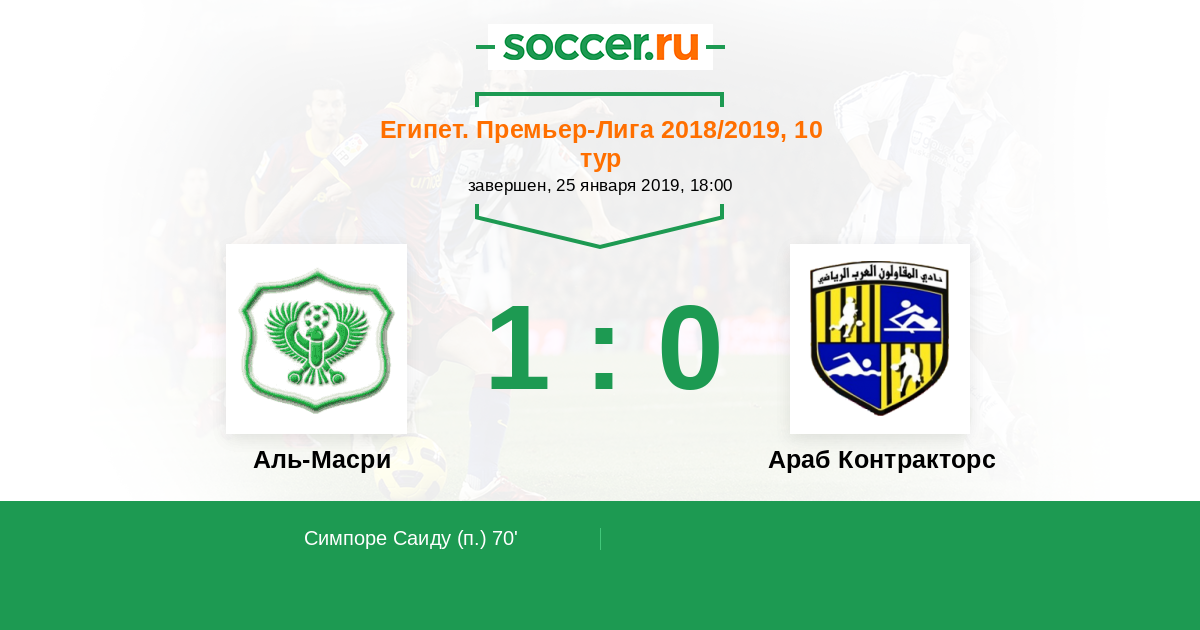 Египет. Премьер-Лига 12.12.2019 Аль-Масри Логотип футбольный клуб Аль-Масри (Порт-Саид) 0:1 Логотип футбольный клуб Араб Контракторс (Каир) Араб Контракторс