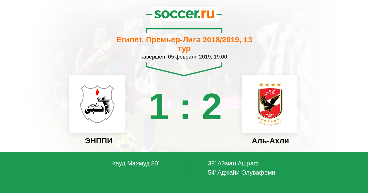 Египет. Премьер-Лига 11.03.2018 ЭНППИ Логотип футбольный клуб ЭНППИ (Каир) 0:1 Логотип футбольный клуб Аль-Ахли (Каир) Аль-Ахли
