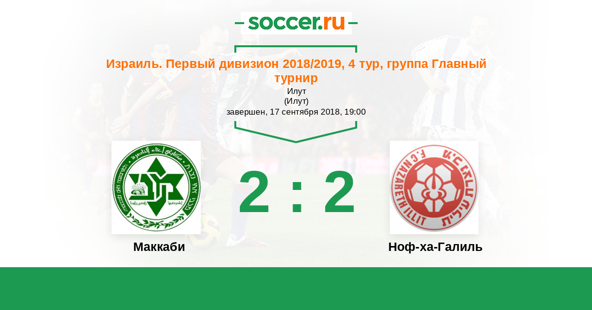 Израиль. Первый дивизион 01.05.2018 Маккаби Логотип футбольный клуб Маккаби (Ахи Назарет) 1:0 Логотип футбольный клуб Ноф-ха-Галиль (Назарет Иллит) Ноф-ха-Галиль