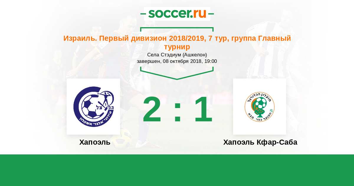 Израиль. Первый дивизион 01.02.2019 Хапоэль Кфар-Саба Логотип футбольный клуб Хапоэль Кфар-Саба 0:2 Логотип футбольный клуб Хапоэль (Ашкелон) Хапоэль