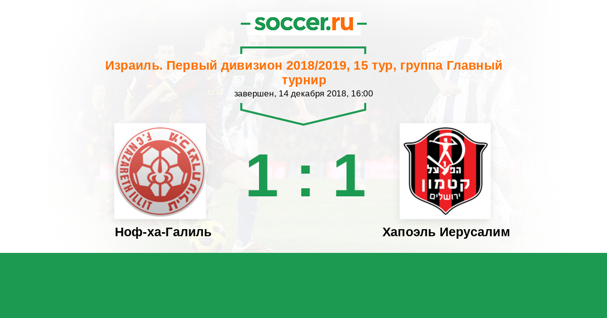 Израиль. Первый дивизион 15.12.2017 Ноф-ха-Галиль Логотип футбольный клуб Ноф-ха-Галиль (Назарет Иллит) 0:0 Логотип футбольный клуб Хапоэль Иерусалим Хапоэль Иерусалим