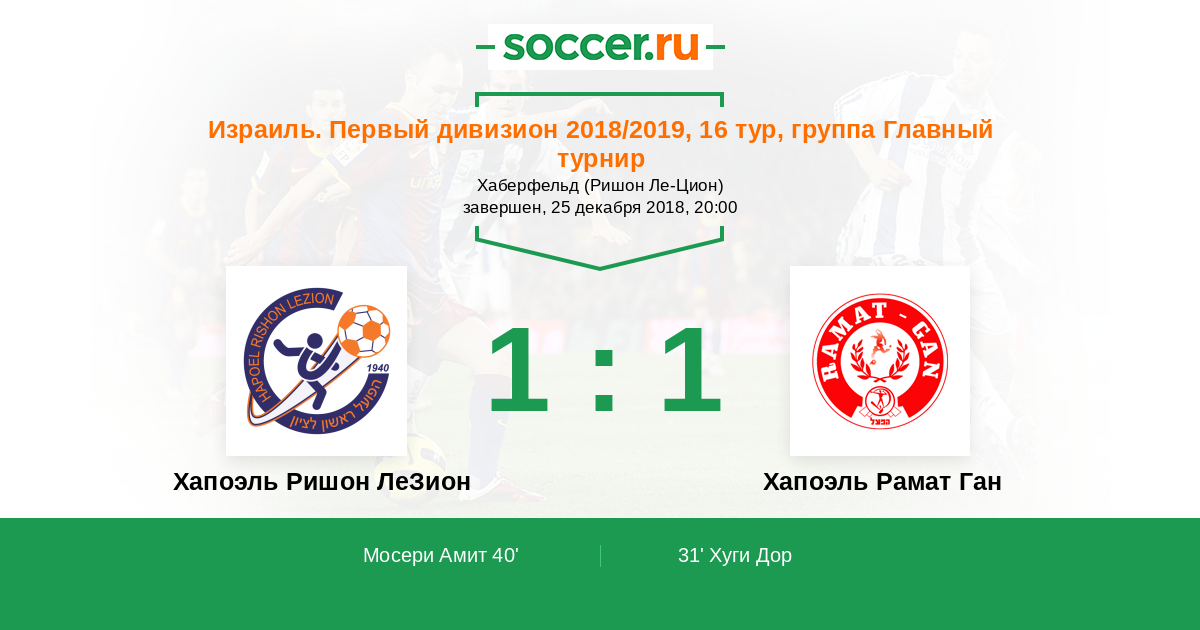 Израиль. Первый дивизион 26.02.2016 Хапоэль Ришон ЛеЗион Логотип футбольный клуб Хапоэль Ришон ЛеЗион 1:1 Логотип футбольный клуб Хапоэль Рамат Ган Хапоэль Рамат Ган
