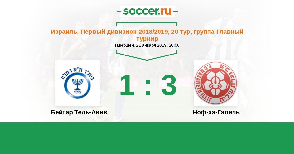 Израиль. Первый дивизион 19.02.2018 Бейтар Тель-Авив Логотип футбольный клуб Бейтар Тель-Авив 2:0 Логотип футбольный клуб Ноф-ха-Галиль (Назарет Иллит) Ноф-ха-Галиль
