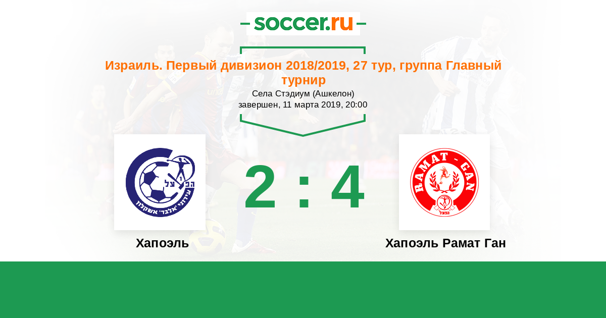 Израиль. Первый дивизион 22.04.2019 Хапоэль Рамат Ган Логотип футбольный клуб Хапоэль Рамат Ган 1:3 Логотип футбольный клуб Хапоэль (Ашкелон) Хапоэль