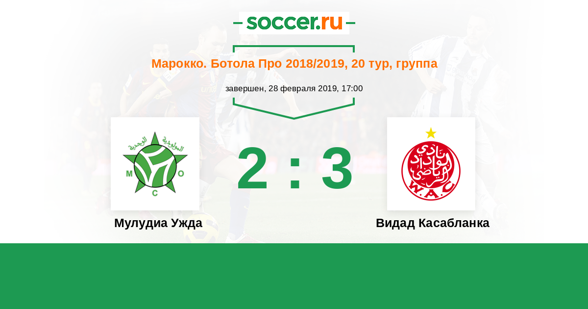 Марокко. Ботола Про 22.03.2024 Мулудиа Ужда Логотип футбольный клуб Мулудиа Ужда 0:2 Логотип футбольный клуб Видад Касабланка Видад Касабланка