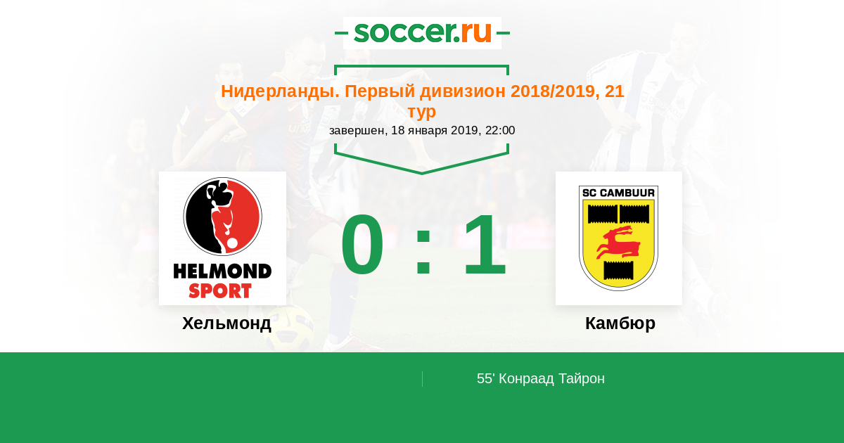 Нидерланды. Первый дивизион 19.10.2018 Камбюр Логотип футбольный клуб Камбюр (Лиуварден) 3:1 Логотип футбольный клуб Хельмонд Хельмонд