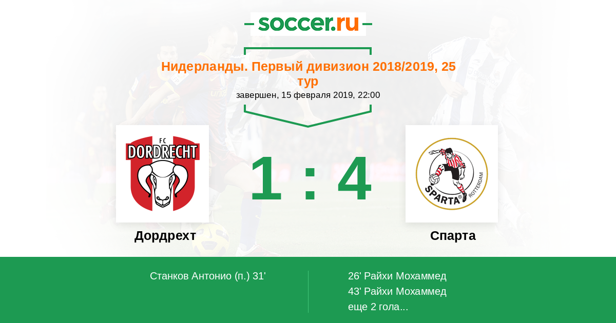 Нидерланды. Первый дивизион 28.09.2018 Спарта Логотип футбольный клуб Спарта (Роттердам) 3:2 Логотип футбольный клуб Дордрехт Дордрехт
