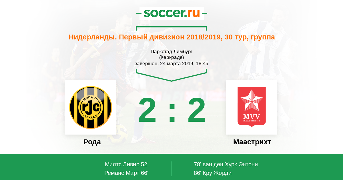 Нидерланды. Первый дивизион 18.11.2018 Маастрихт Логотип футбольный клуб Маастрихт 2:0 Логотип футбольный клуб Рода (Керкраде) Рода
