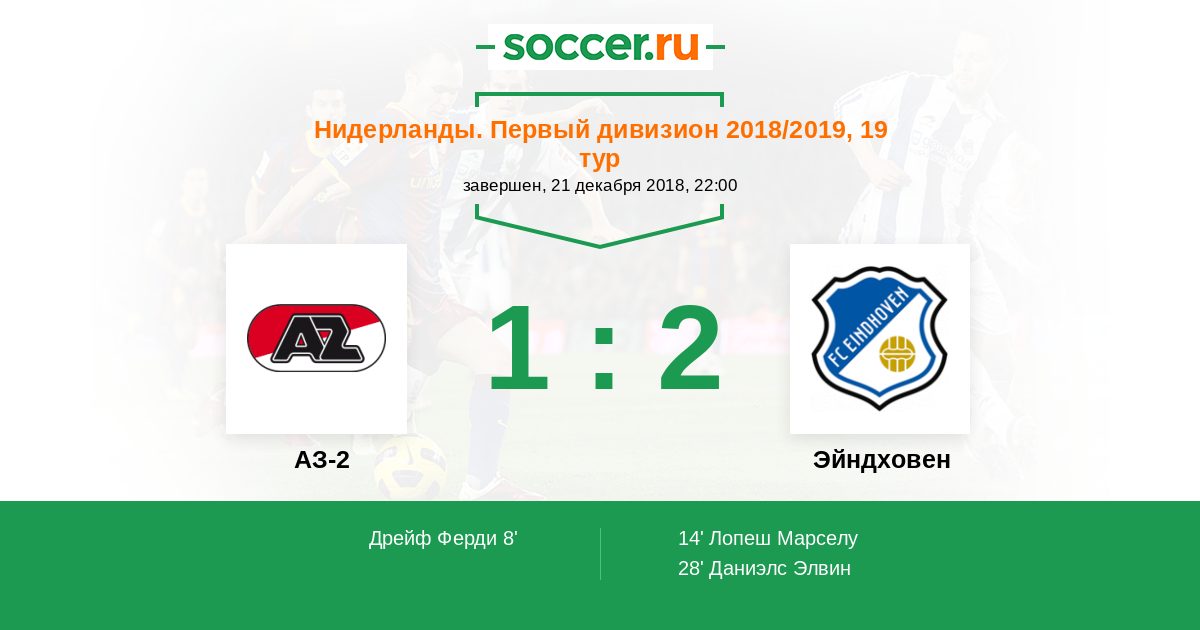 Нидерланды. Первый дивизион 29.09.2017 АЗ-2 Логотип футбольный клуб АЗ-2 (Алкмар) 1:2 Логотип футбольный клуб Эйндховен Эйндховен