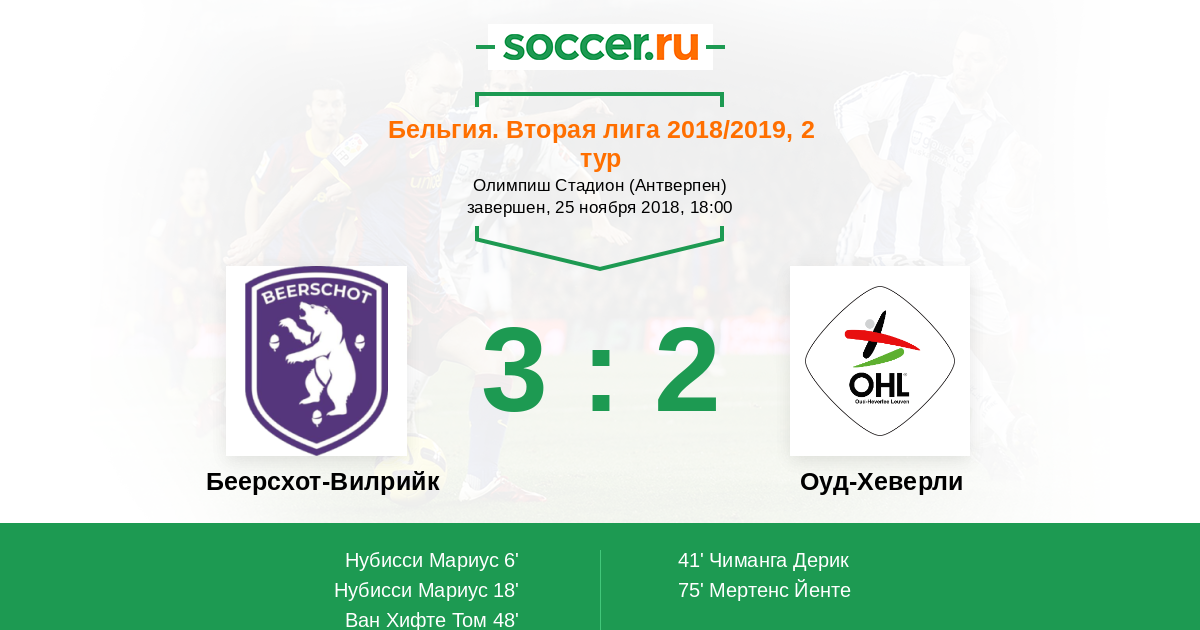 Бельгия. 1B Про Лига 26.10.2018 Беерсхот-Вилрийк Логотип футбольный клуб Беерсхот-Вилрийк 3:1 Логотип футбольный клуб Оуд-Хеверли (Левен) Оуд-Хеверли