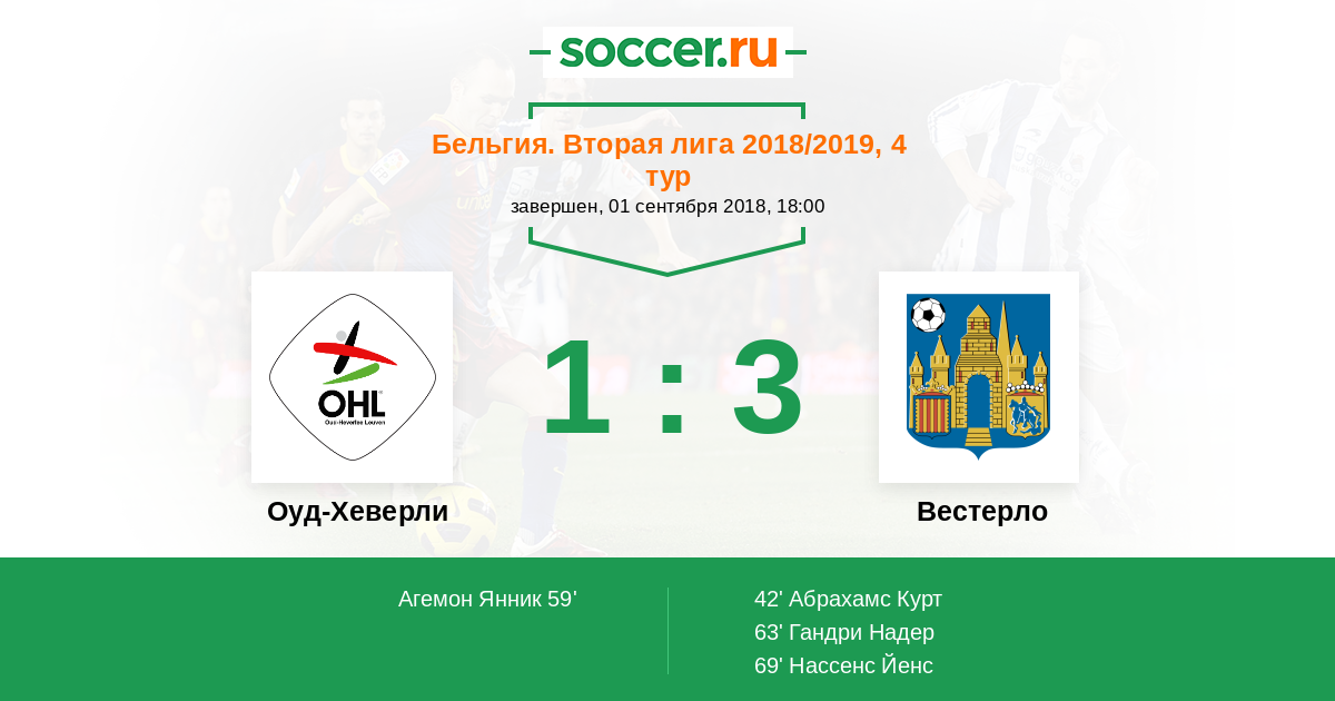 Бельгия. 1B Про Лига 08.10.2017 Оуд-Хеверли Логотип футбольный клуб Оуд-Хеверли (Левен) 2:1 Логотип футбольный клуб Вестерло Вестерло