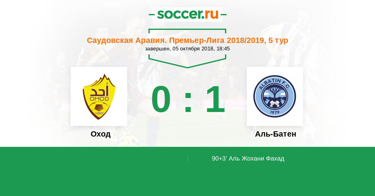 Саудовская Аравия. Первый дивизион 05.10.2019 Аль-Батен Логотип футбольный клуб Аль-Батен (Хафар-аль-Батен) 1:1 Логотип футбольный клуб Оход (Медина) Оход
