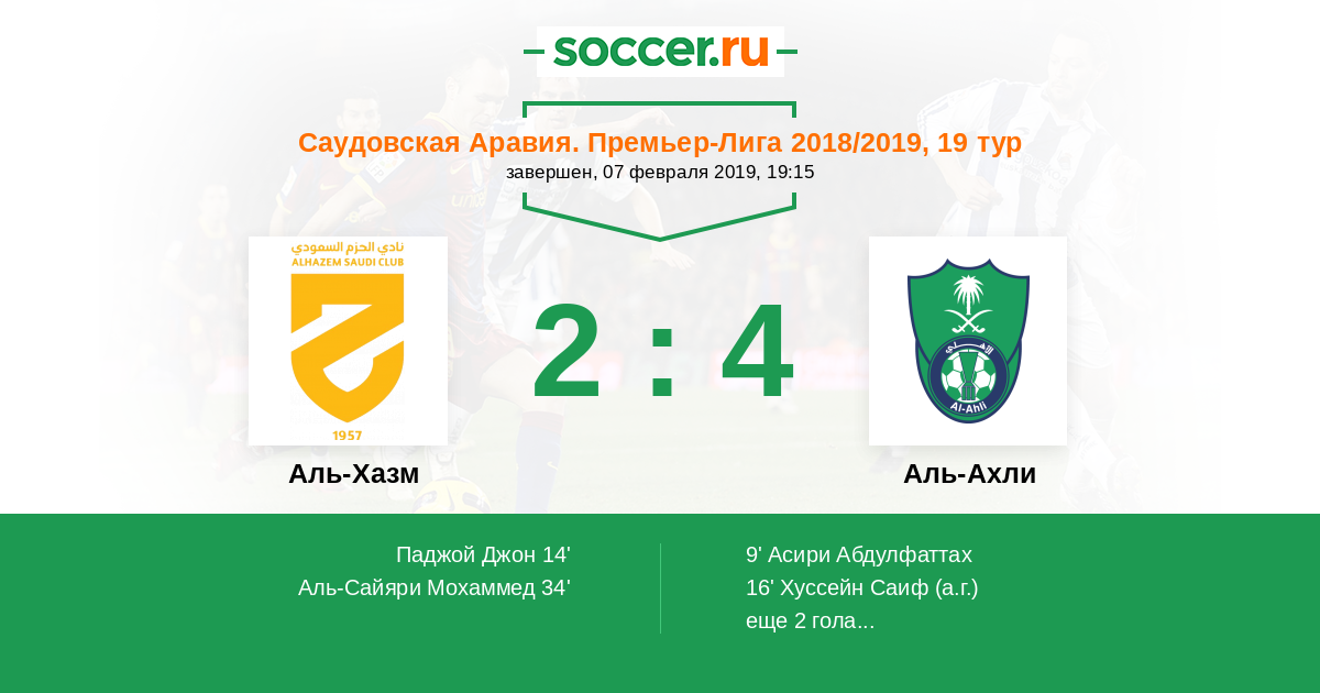 Саудовская Аравия. Премьер-Лига 26.10.2019 Аль-Хазм Логотип футбольный клуб Аль-Хазм (Эр-Расс) 2:1 Логотип футбольный клуб Аль-Ахли (Джидда) Аль-Ахли