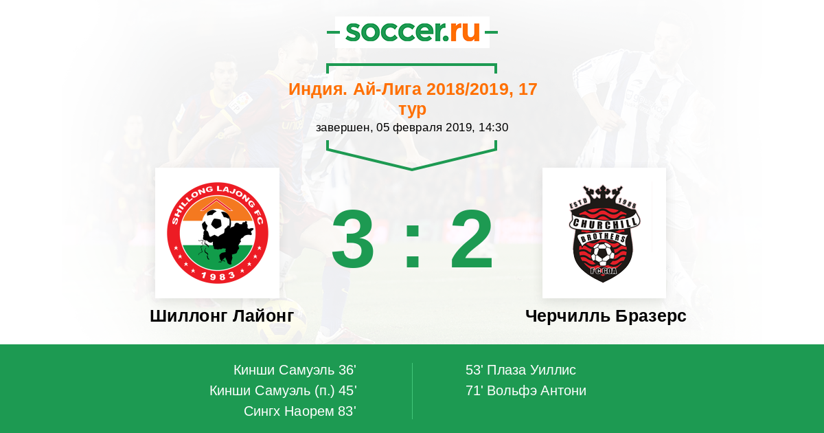 Индия. Ай-Лига 05.02.2017 Шиллонг Лайонг Логотип футбольный клуб Шиллонг Лайонг 1:0 Логотип футбольный клуб Черчилль Бразерс (Маргао) Черчилль Бразерс