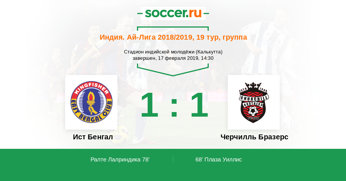 Индия. Ай-Лига 16.12.2017 Ист Бенгал Логотип футбольный клуб Ист Бенгал (Калькутта) 3:2 Логотип футбольный клуб Черчилль Бразерс (Маргао) Черчилль Бразерс