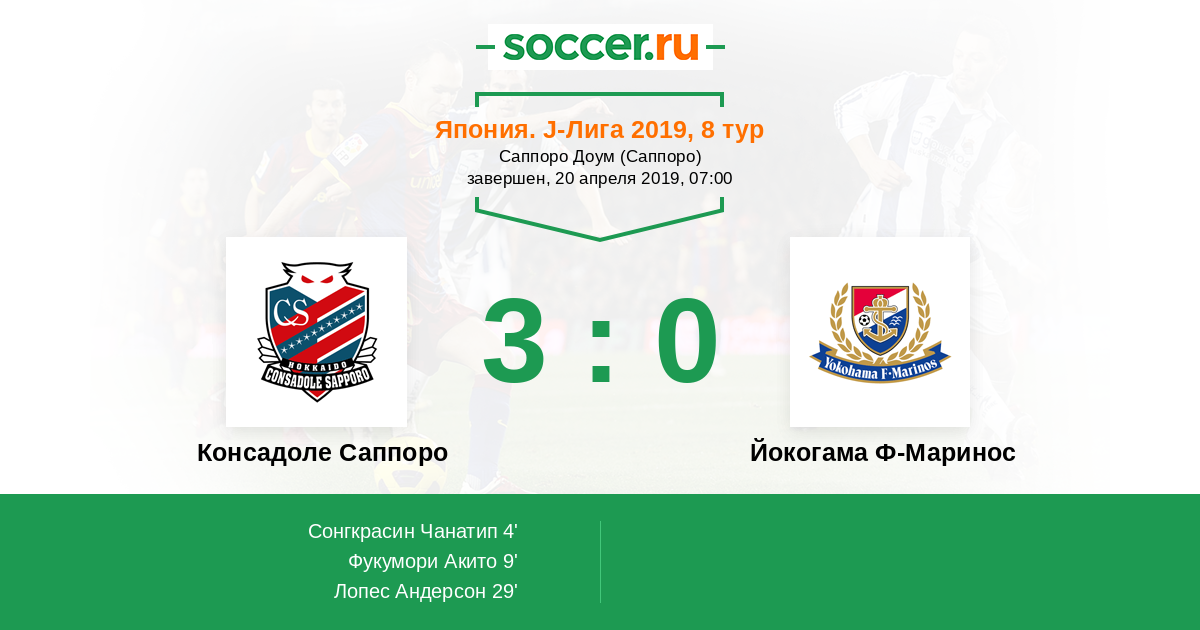 Япония. J-Лига 1 25.04.2018 Консадоле Саппоро Логотип футбольный клуб Консадоле Саппоро 2:1 Логотип футбольный клуб Йокогама Ф-Маринос Йокогама Ф-Маринос