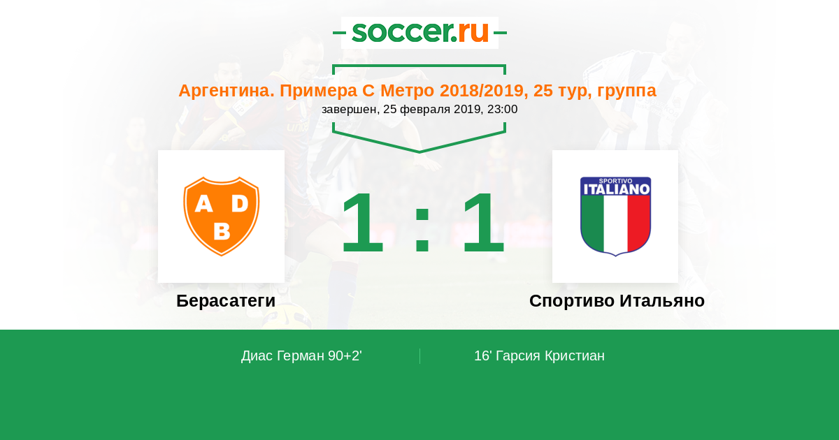 Аргентина. Примера С Метро 08.11.2017 Берасатеги Логотип футбольный клуб Берасатеги (Буэнос-Айрес) 1:1 Логотип футбольный клуб Спортиво Итальяно (Буэнос-Айрес) Спортиво Итальяно