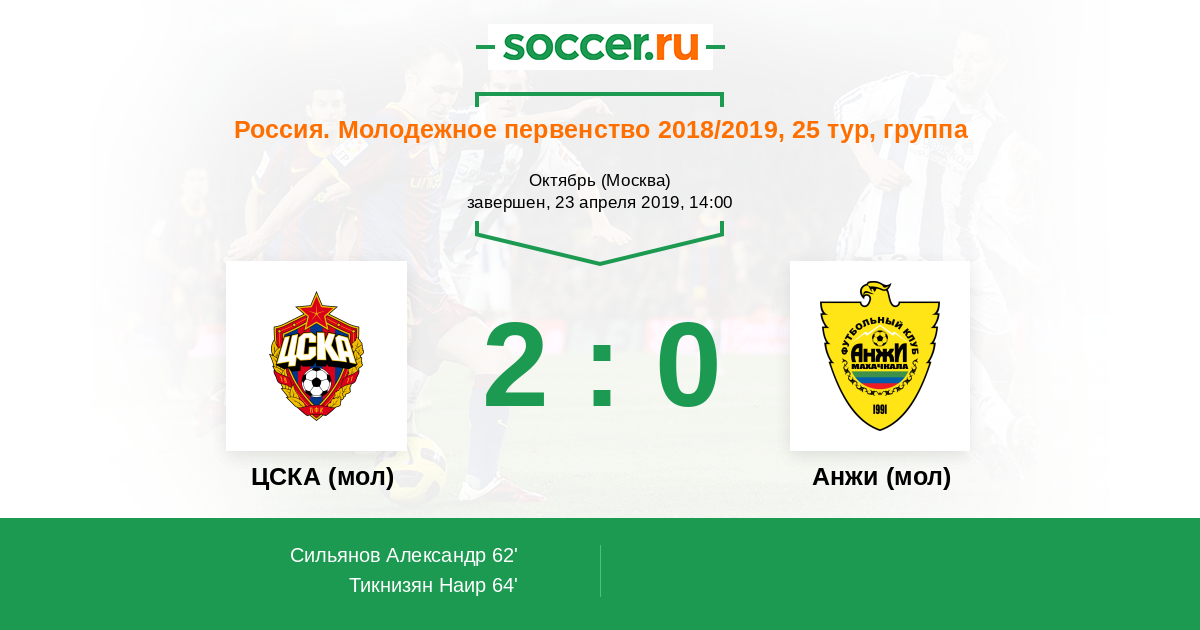 Россия. Премьер-Лига U21 23.03.2014 Анжи (мол) Логотип футбольный клуб Анжи (мол) (Махачкала) 2:1 Логотип футбольный клуб ЦСКА (мол) (Москва) ЦСКА (мол)