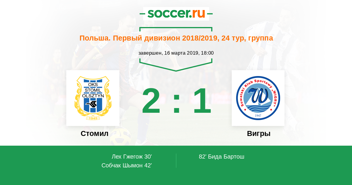 Польша. Первый дивизион 04.04.2018 Стомил Логотип футбольный клуб Стомил (Ольштин) 1:2 Логотип футбольный клуб Вигры (Сувалки) Вигры