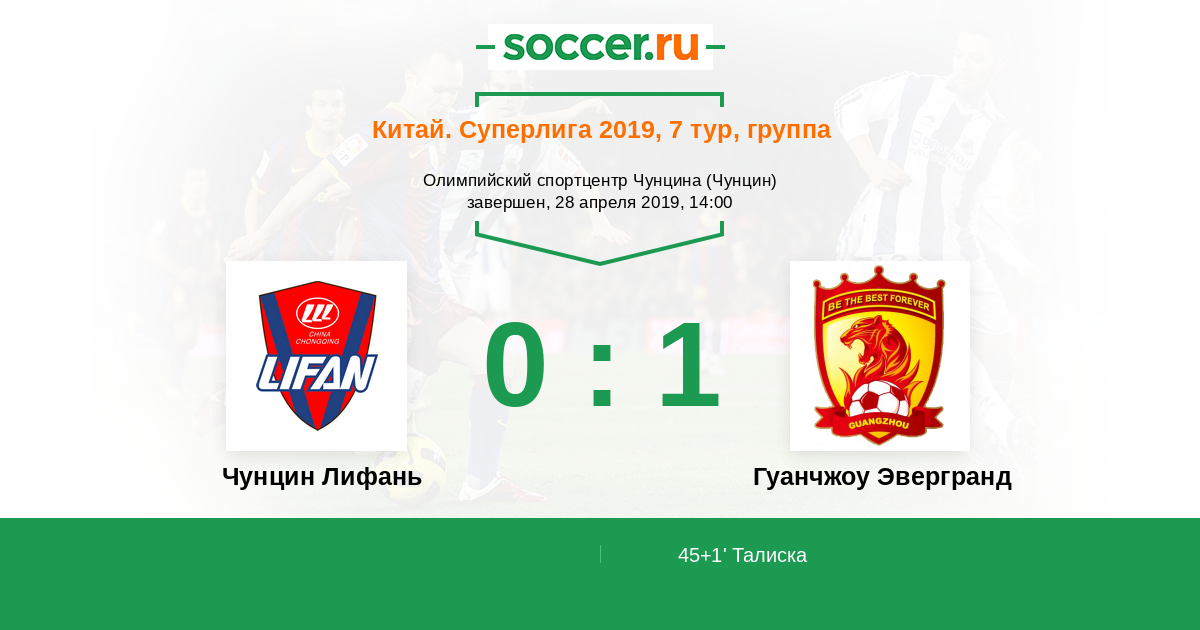 Китай. Суперлига 15.08.2019 Гуанчжоу Эвергранд Логотип футбольный клуб Гуанчжоу Эвергранд 1:1 Логотип футбольный клуб Чунцин Лифань Чунцин Лифань