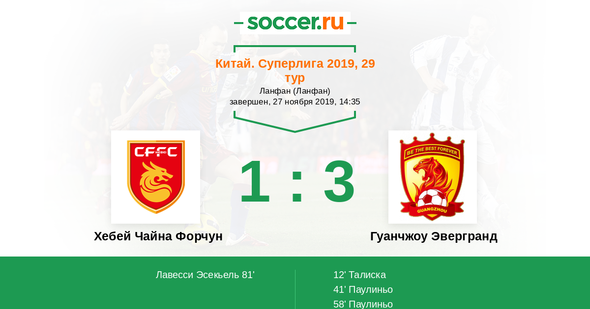 Китай. Суперлига 29.10.2017 Хебей Чайна Форчун Логотип футбольный клуб Хебей Чайна Форчун (Циньхуандао) 3:0 Логотип футбольный клуб Гуанчжоу Эвергранд Гуанчжоу Эвергранд