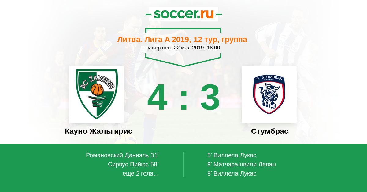 Литва. Лига А 11.05.2017 Стумбрас Логотип футбольный клуб Стумбрас (Каунас) 3:0 Логотип футбольный клуб Кауно Жальгирис (Каунас) Кауно Жальгирис