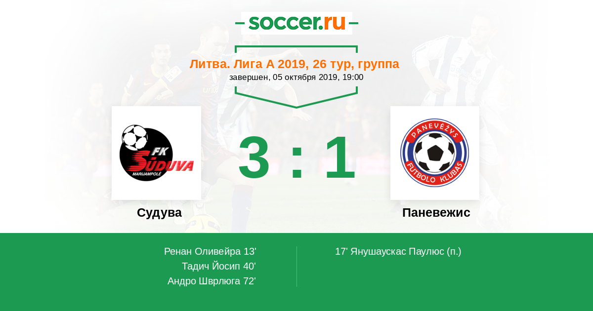 Литва. Лига А 15.06.2019 Судува Логотип футбольный клуб Судува (Мариямполе) 2:1 Логотип футбольный клуб Паневежис Паневежис