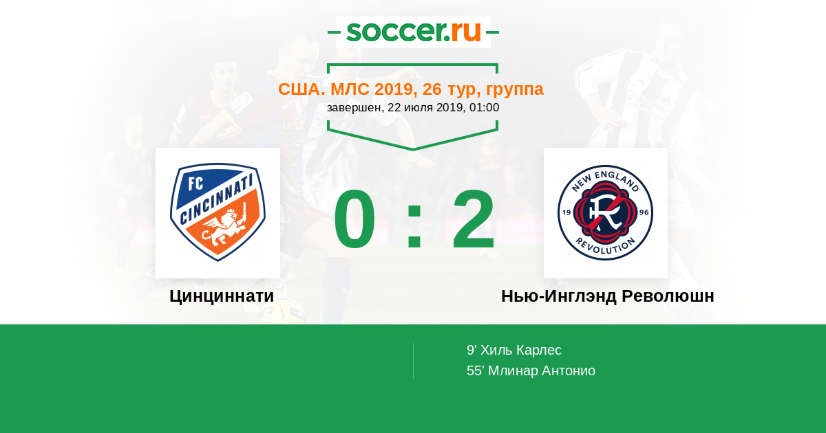 США. МЛС 24.03.2019 Нью-Инглэнд Революшн Логотип футбольный клуб Нью-Инглэнд Революшн (Фоксборо) 0:2 Логотип футбольный клуб Цинциннати Цинциннати