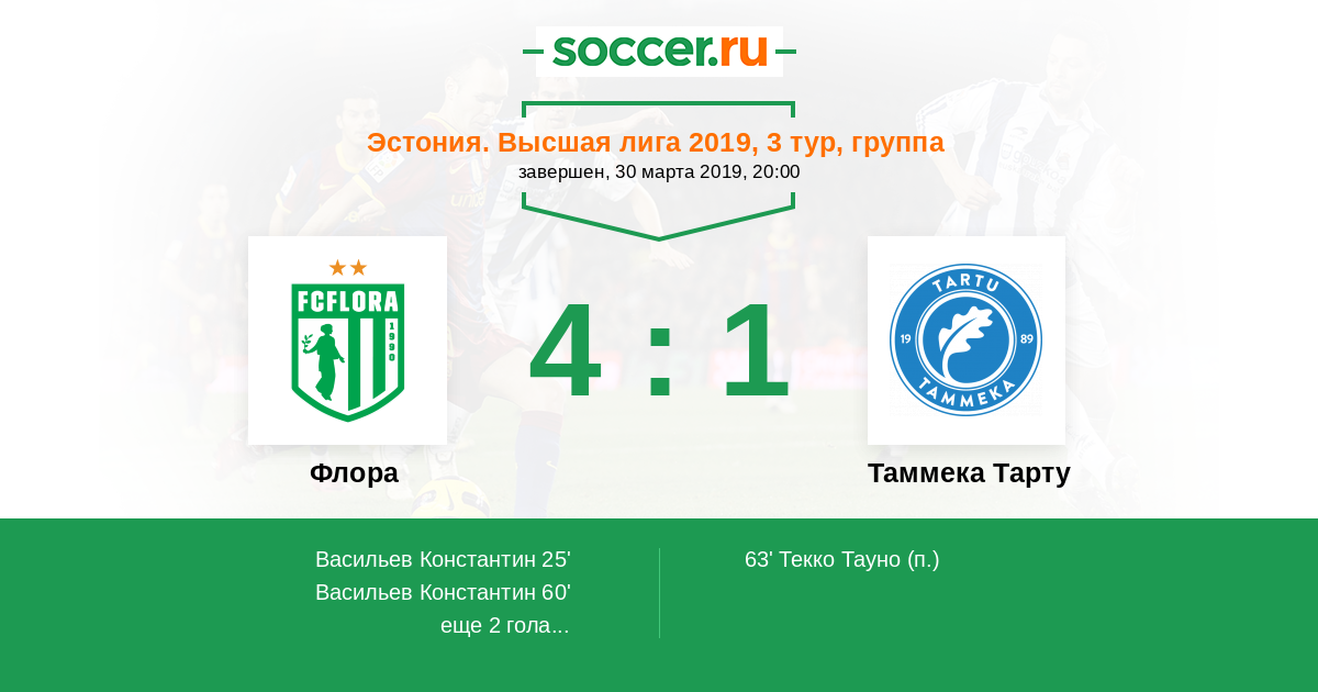 Эстония. Высшая лига 01.04.2017 Флора Логотип футбольный клуб Флора (Таллин) 4:0 Логотип футбольный клуб Таммека Тарту Таммека Тарту