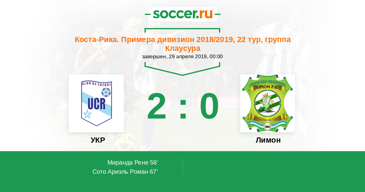 Коста-Рика. Примера дивизион 18.02.2019 Лимон Логотип футбольный клуб Лимон 1:2 Логотип футбольный клуб УКР (Сан Хосе) УКР