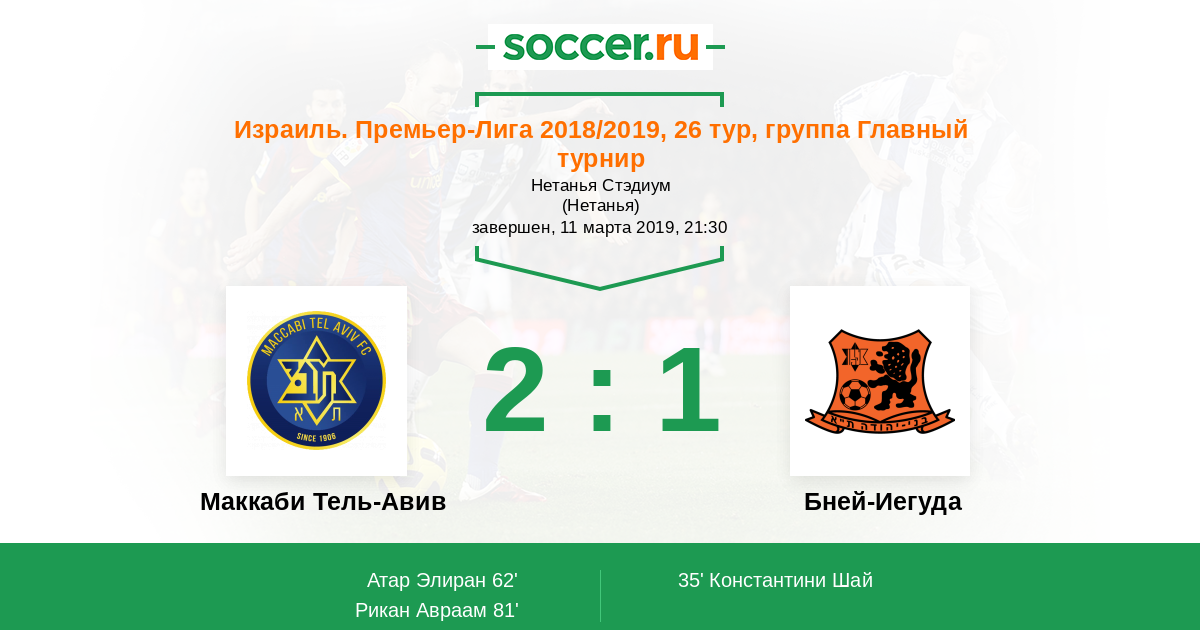 Израиль. Премьер-Лига 02.04.2011 Бней-Иегуда Логотип футбольный клуб Бней-Иегуда (Тель-Авив) 2:0 Логотип футбольный клуб Маккаби Тель-Авив Маккаби Тель-Авив