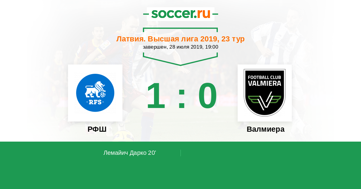 Латвия. Высшая лига 29.07.2020 РФШ Логотип футбольный клуб РФШ (Рига) 5:2 Логотип футбольный клуб Валмиера (Валмиера Гласс) Валмиера