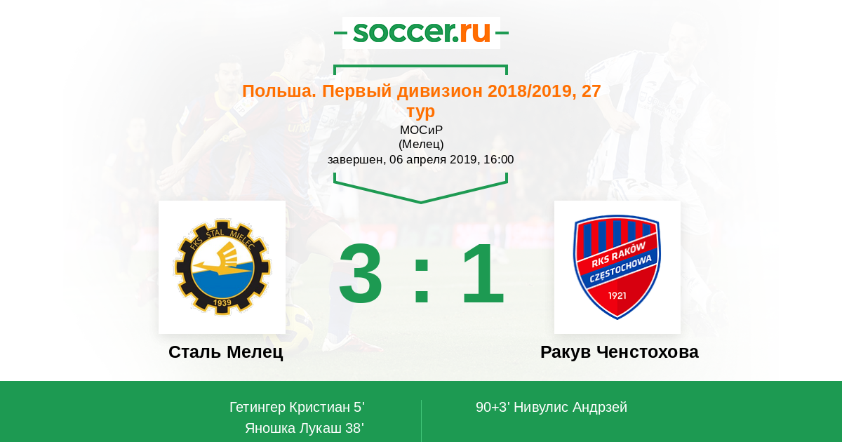 Польша. Первый дивизион 07.04.2018 Сталь Мелец Логотип футбольный клуб Сталь Мелец 2:3 Логотип футбольный клуб Ракув Ченстохова Ракув Ченстохова