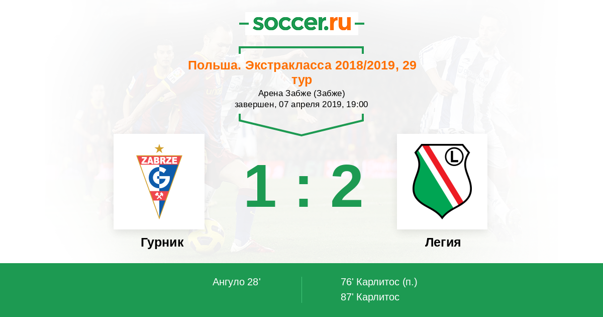 Польша. Экстракласса 15.03.2013 Легия Логотип футбольный клуб Легия (Варшава) 3:0 Логотип футбольный клуб Гурник (Забже) Гурник