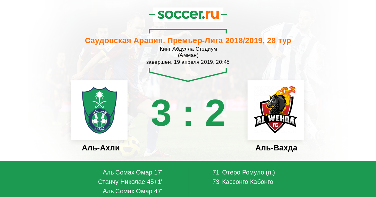 Саудовская Аравия. Премьер-Лига 14.09.2019 Аль-Ахли Логотип футбольный клуб Аль-Ахли (Джидда) 1:2 Логотип футбольный клуб Аль-Вахда (Мекка) Аль-Вахда