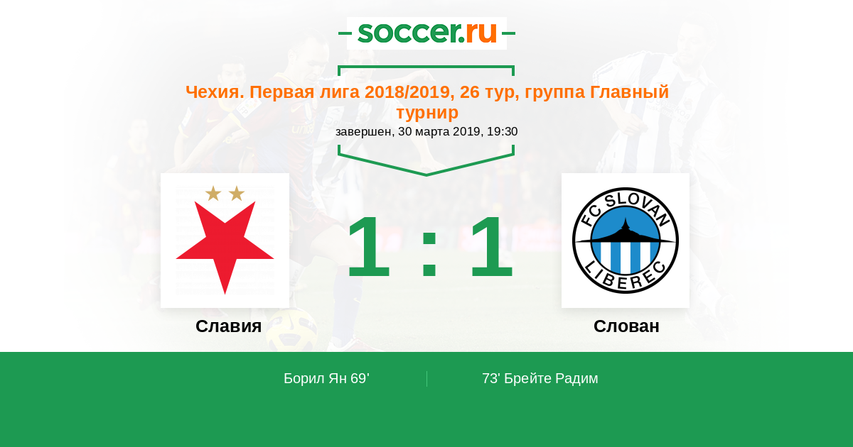 Чехия. Первая Лига 18.03.2017 Слован Логотип футбольный клуб Слован (Либерец) 1:1 Логотип футбольный клуб Славия (Прага) Славия