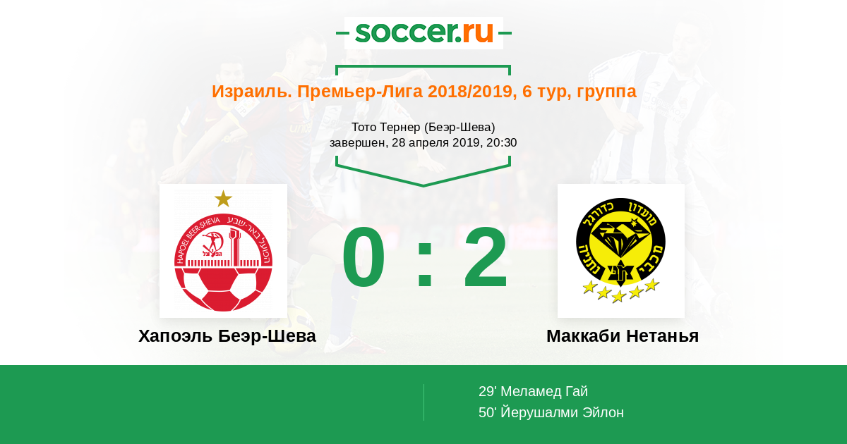 Израиль. Премьер-Лига 22.04.2018 Маккаби Нетанья Логотип футбольный клуб Маккаби Нетанья 1:5 Логотип футбольный клуб Хапоэль Беэр-Шева Хапоэль Беэр-Шева