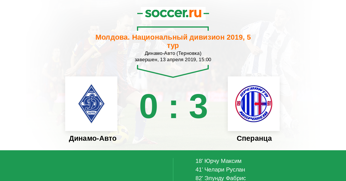 Молдова. Национальный дивизион 03.04.2016 Динамо-Авто Логотип футбольный клуб Динамо-Авто (Тирасполь) 2:1 Логотип футбольный клуб Сперанца (Крихана Веке) Сперанца
