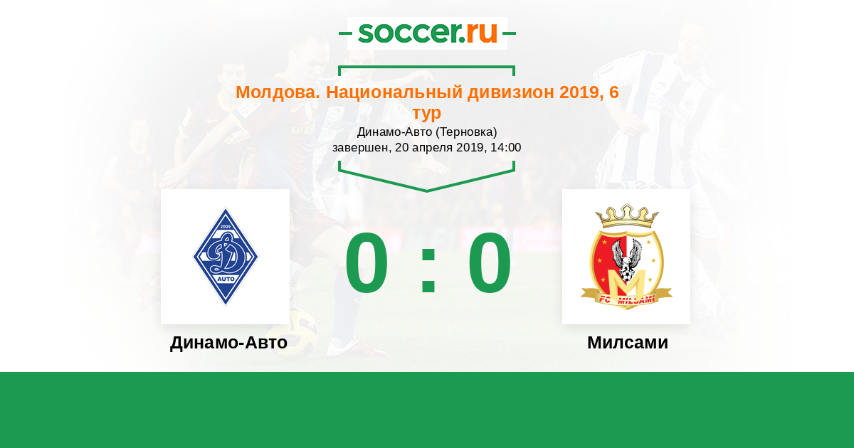 Молдова. Национальный дивизион 16.06.2019 Милсами Логотип футбольный клуб Милсами (Оргеев) 3:1 Логотип футбольный клуб Динамо-Авто (Тирасполь) Динамо-Авто