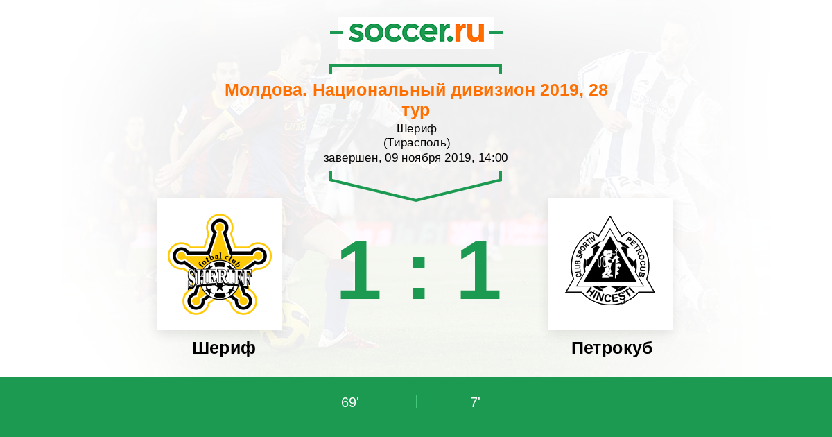 Молдова. Национальный дивизион 01.04.2018 Шериф Логотип футбольный клуб Шериф (Тирасполь) 3:0 Логотип футбольный клуб Петрокуб (Хынчешты) Петрокуб