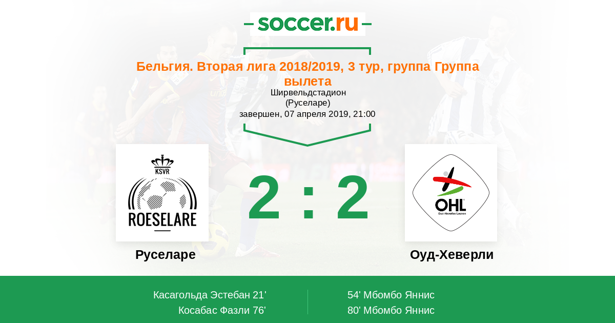 Бельгия. 1B Про Лига 14.04.2019 Оуд-Хеверли Логотип футбольный клуб Оуд-Хеверли (Левен) 3:0 Логотип футбольный клуб Руселаре Руселаре