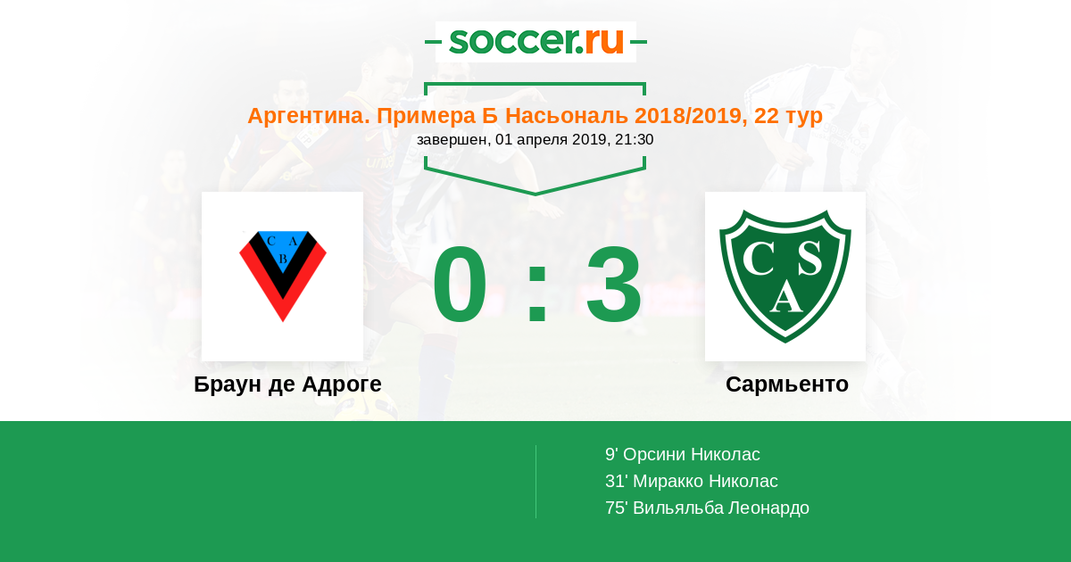 Аргентина. Примера Б Насьональ 05.05.2019 Браун де Адроге Логотип футбольный клуб Браун де Адроге 0:1 Логотип футбольный клуб Сармьенто (Хунин) Сармьенто