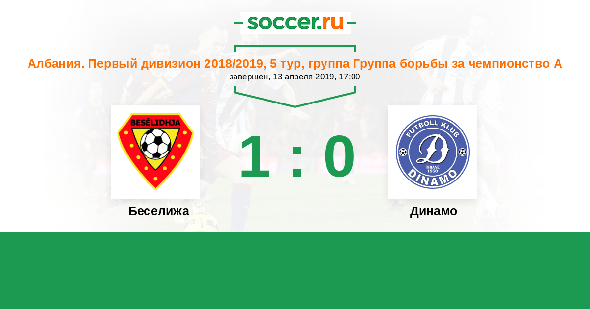 Албания. Первый дивизион 13.04.2019 Беселижа Логотип футбольный клуб Беселижа (Леже) 1:0 Логотип футбольный клуб Динамо Сити (Тирана) Динамо Сити