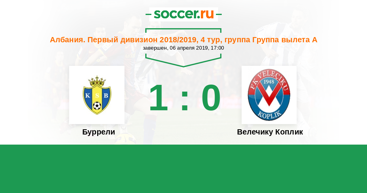 Албания. Первый дивизион 06.04.2019 Буррели Логотип футбольный клуб Буррели 1:0 Логотип футбольный клуб Велечику Коплик Велечику Коплик