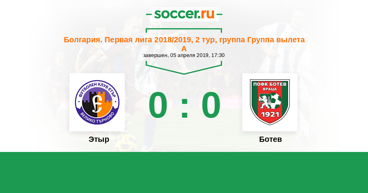 Болгария. Первая лига 25.04.2019 Ботев Логотип футбольный клуб Ботев (Враца) 1:1 Логотип футбольный клуб Этыр (Велико-Тырново) Этыр